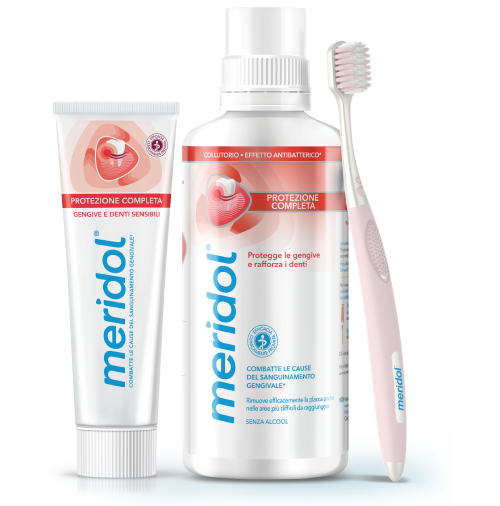 Proteggi le gengive e rafforza i tuoi denti con il collutorio meridol Protezione completa. Questo collutorio per le gengive è stato sapientemente creato per combattere la causa principale* del sanguinamento delle gengive e dell'infiammazione. Il collutorio protegge inoltre le gengive e rafforza i denti, mentre la sua efficace formula a doppia azione fornisce una protezione antibatterica di lunga durata*. Protegge dalla carie, garantisce un alito fresco e rafforza lo smalto.